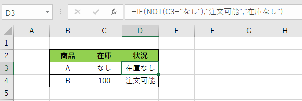 =IF(NOT(在庫=”なし”), “注文可能”, “在庫なし”)